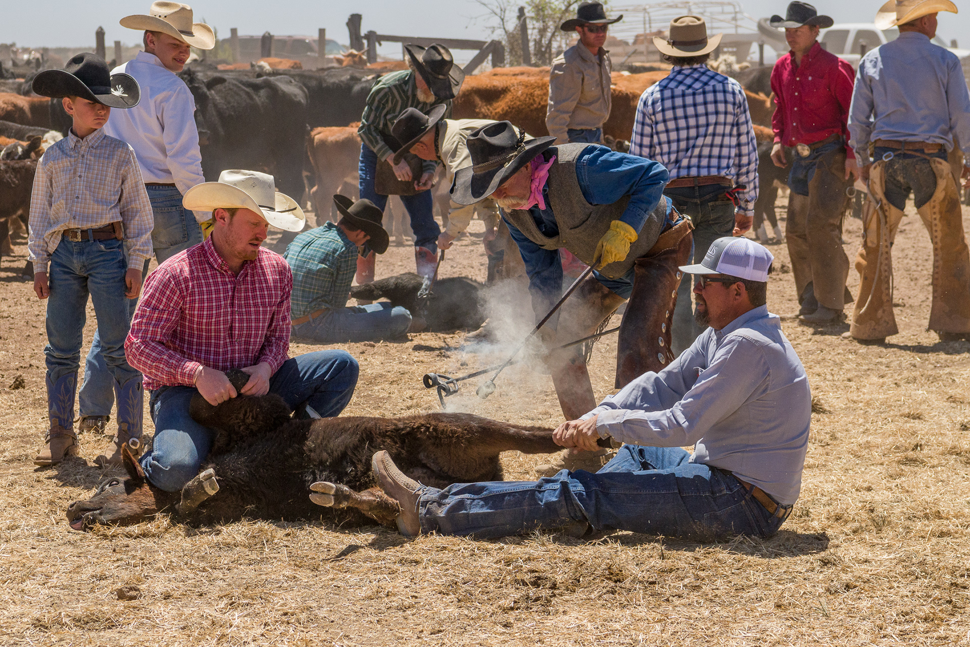 The spring branding is an important part of running a ranch. On the Kokernot 06 Ranch, the roundup and branding is performed as it was in the days of the old west. Cowboys on well trained horses rope a calf by the hind legs (heeling) and drag them to be taged with a brand and the young bulls not designated for breeding are castrated. In these modern times, the only new things are the cattle are given shots to keep them healthy and the branding irons are heating by propane, not an open fire.